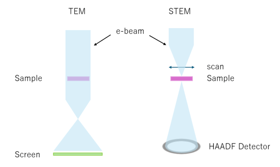 透過電子顕微鏡(TEM)は、サンプルを透過してきた電子線を電磁レンズで拡大することで観察します。走査透過電子顕微鏡(STEM)は、細く絞った電子ビームをスキャンしながらサンプルを透過し散乱された電子線を検出して観察します。TEMは、
